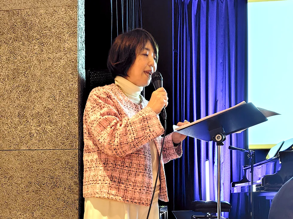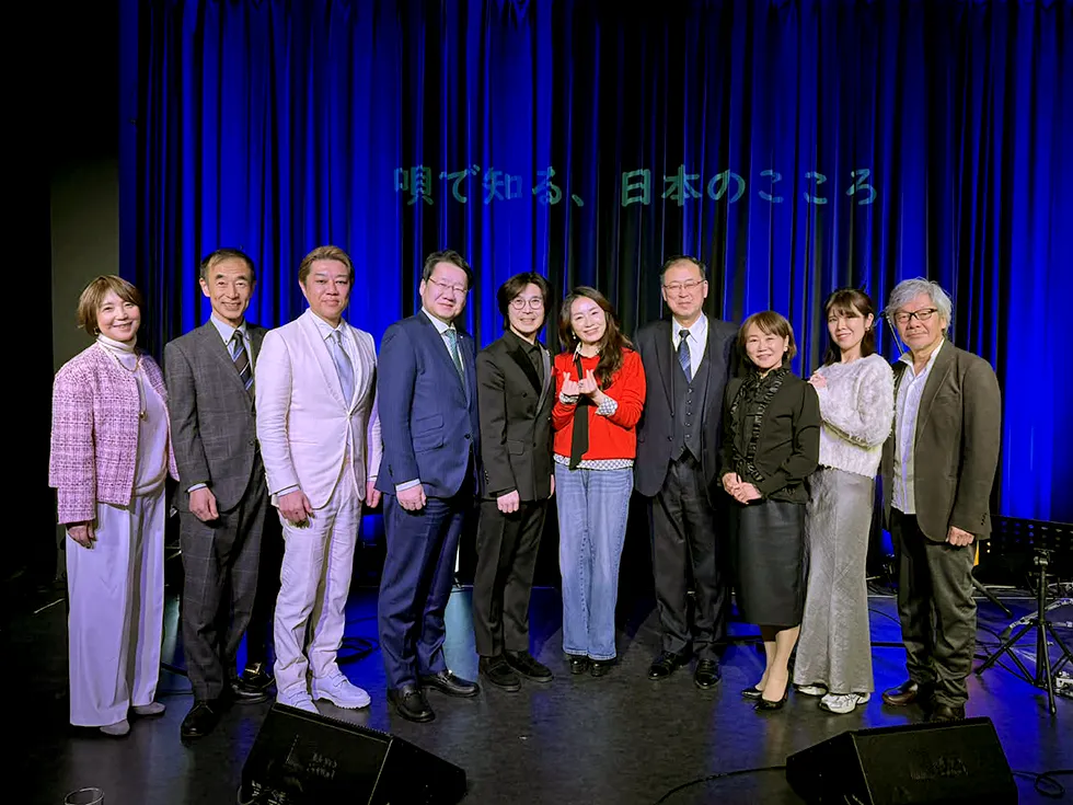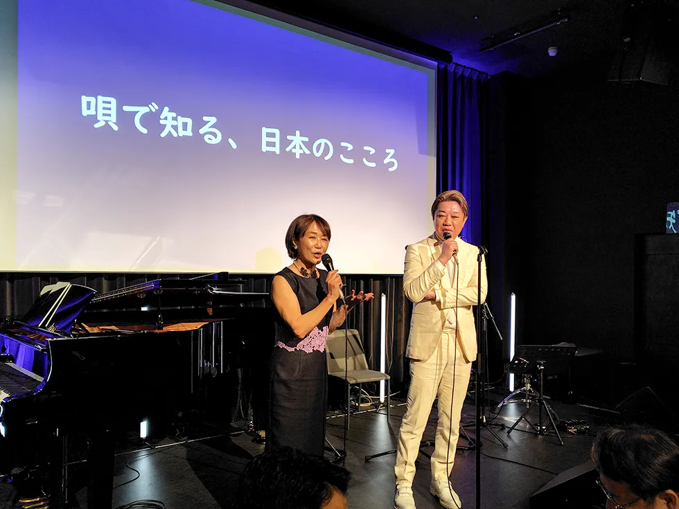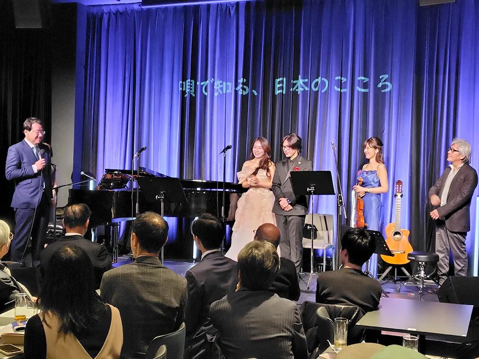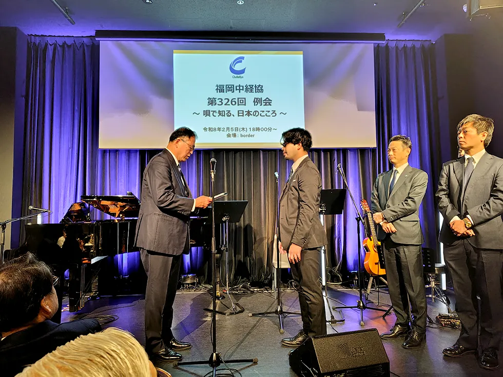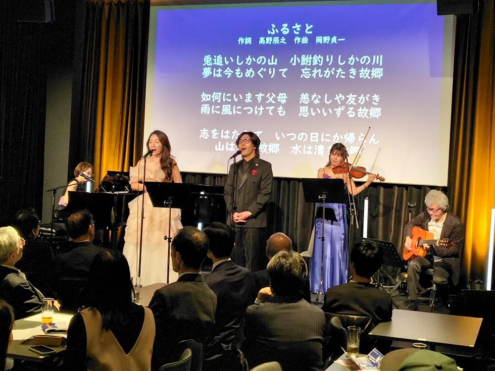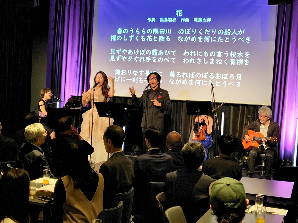 第326回例会は日本の古き良き童謡・唱歌をテーマとし、例年好評をいただいている「唄で知る、日本のこころ」を開催した。今年も福岡のクリエイティブライター集団であり「コトバのチカラ」でお馴染み、株式会社チカラ 代表取締役の元木哲三氏による、作者・時代背景・制作秘話・童謡と唱歌の違いなどの解説で曲への理解を深めていただいた。また、今年はボーカルに韓国から混声ポペラデュエット「HUE(ヒュ)」を招き、その圧倒的な歌唱力と日本人の琴線に触れる表現力で会場は感動と癒しで包まれていた。