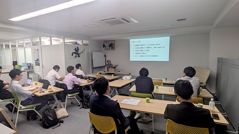 9月例会では、「生成AIの活用法」をテーマに、株式会社リクメディア 代表 藤村賢志 氏を講師にお迎えし、ご講演いただいた。生成AIの最新動向から企業での導入方法、さらには資料作成の実践的な活用例まで、具体的かつ分かりやすくご紹介いただいた。講演後の交流会では、藤村氏を囲んで活発な意見交換が行われ、学びと交流の深まる有意義な例会となった。