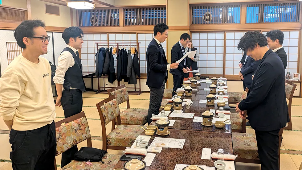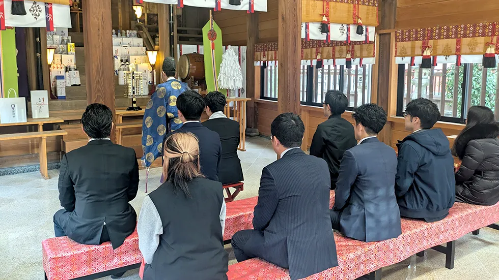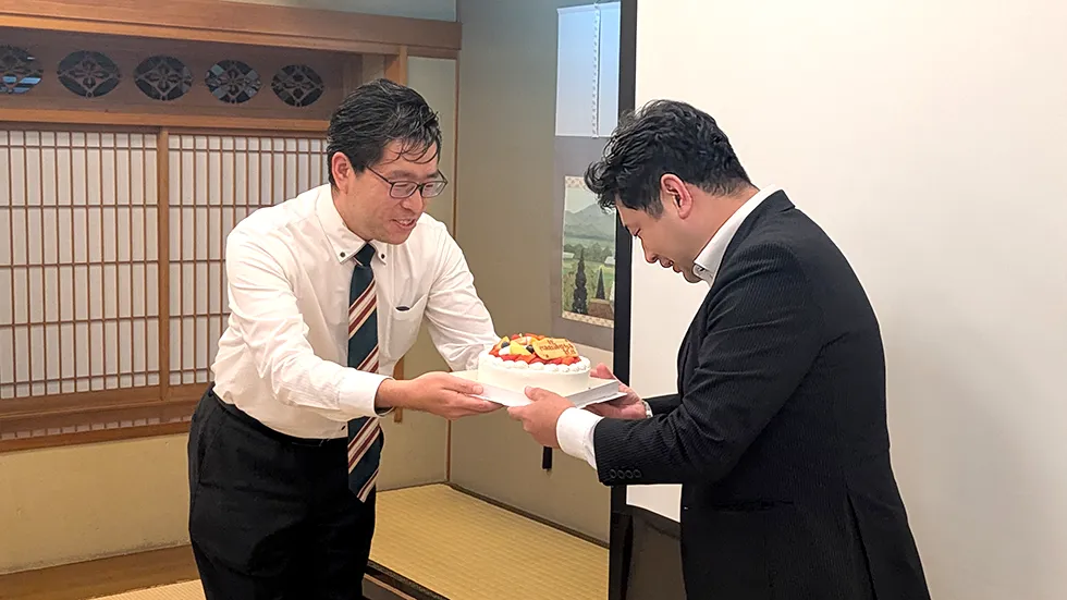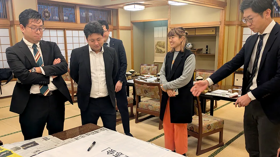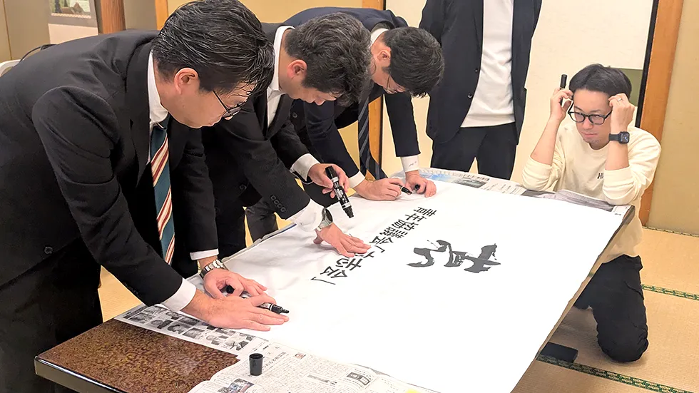 1月例会は、新年最初の例会として警固神社でご祈祷を受けた後、稚加栄にて新年会を開催した。今年1年の抱負を立志会旗に記し、決意を新たにするとともに、この度、株式会社広田工務店の代表取締役社長に就任された廣田代表へサプライズで記念品を贈呈した。